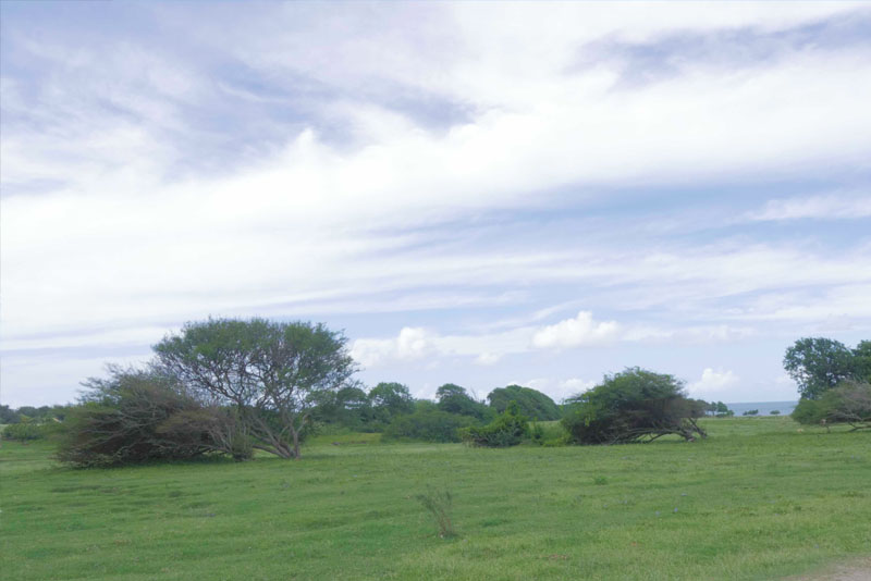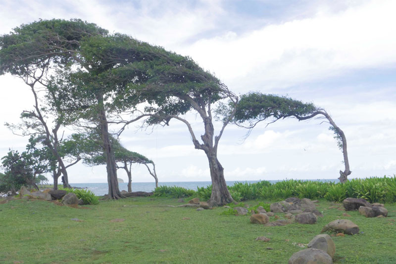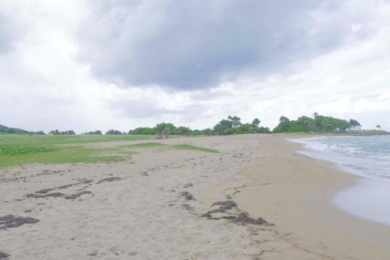 C’est aussi une immense plage de sable et de galets volcaniques, peu fréquentée, très venteuse, comme en témoignent les arbres courbés par le vent des Alizés.