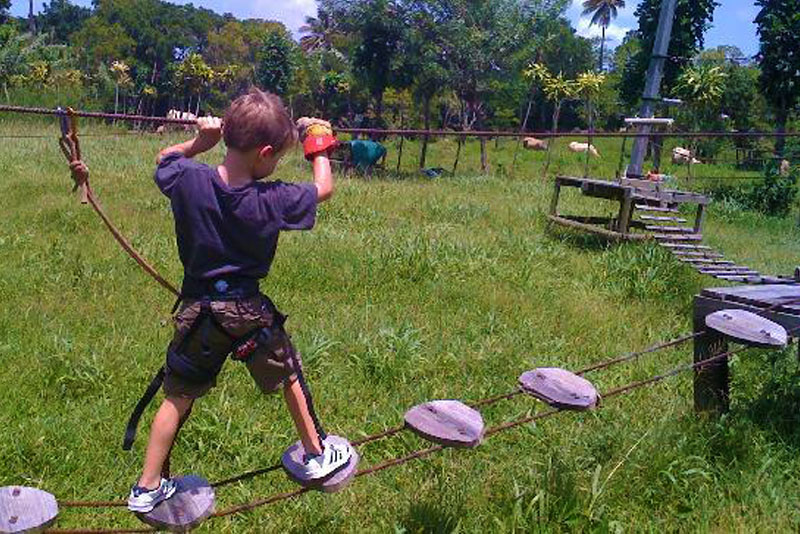 Accessible à tous, petits et grands de tous niveaux, ce parc d’attraction est tonique et nature ! Mur, filet, passerelles oscillantes, ponts de singes, poutres et rondins suspendus, saut de Tarzan… Près de 50 ateliers pour un pur moment de sensations fortes suspendues dans les arbres. Le must du parcours ? La tyrolienne de 250 m de longueur ! Accroché à un câble, jusqu’à 10 m de hauteur, vous survolez une plantation de café, une rivière et d’autres merveilles du jardin tropical. En plus du parcours, vous pourrez participer à une course d’orientation, muni d’une boussole et d’une carte, à la découverte d’indices cachés au coeur de la forêt tropicale ! Autres activités ludiques : le mur d’escalade sur un monolithe de 10 m de hauteur avec 90 m² de surface de grimpe et plus de 250 prises, les trampolines géants, le baby-foot, le mini-golf…